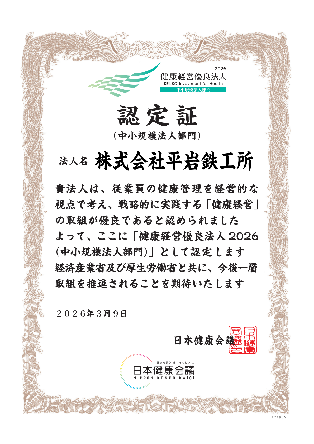 株式会社平岩鉄工所は「健康経営優良法人2026(中小規模法人部門)」に4年連続で認定されました。