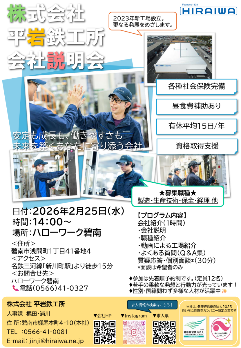 株式会社平岩鉄工所は、ハローワーク碧南にて会社説明会を実施します。